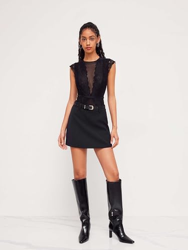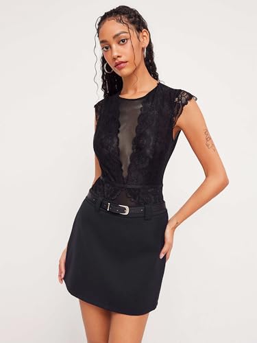 CIDER Lace Round Neckline Solid Cut Out See-through Bodysuit