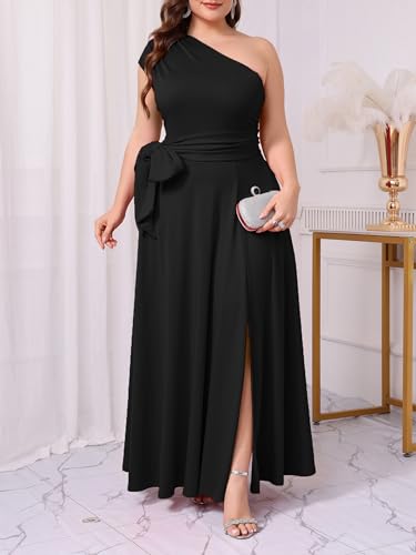 Ekaliy Women's One Shoulder Belted Maxi Dress Long Formal Wedding Guest Dress with Pockets