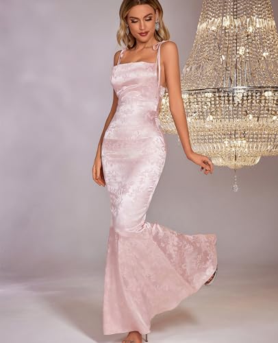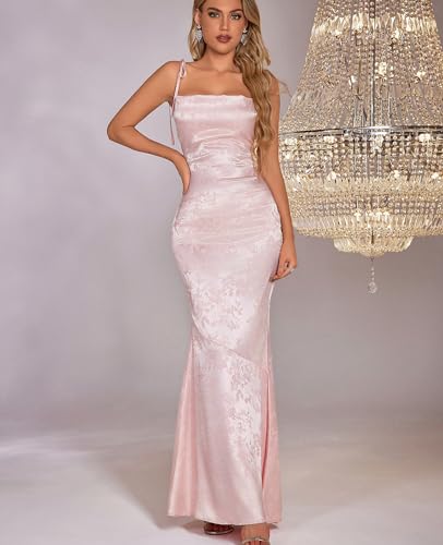 GLNEGE Women's Satin Bodycon Maxi Dress Elegant Formal Spaghetti Strap Cowl Neck Evening Party Dresses