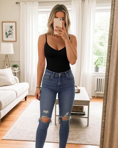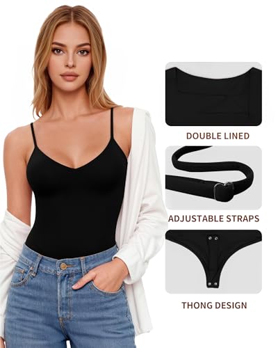 MANGOPOP Women's Cami Thong Bodysuit Double Lined Plunge Deep V Neck Backless Body Suit Adjustable Spaghetti Strap Tank Tops