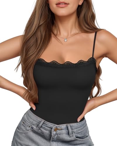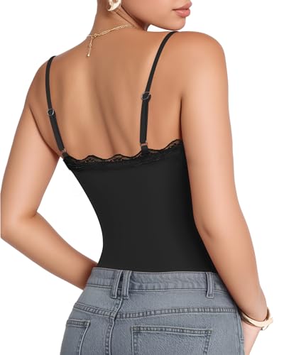 MANGOPOP Women's Cami Thong Bodysuit Double Lined Square Neck Backless Body Suit Adjustable Spaghetti Strap Tank Tops