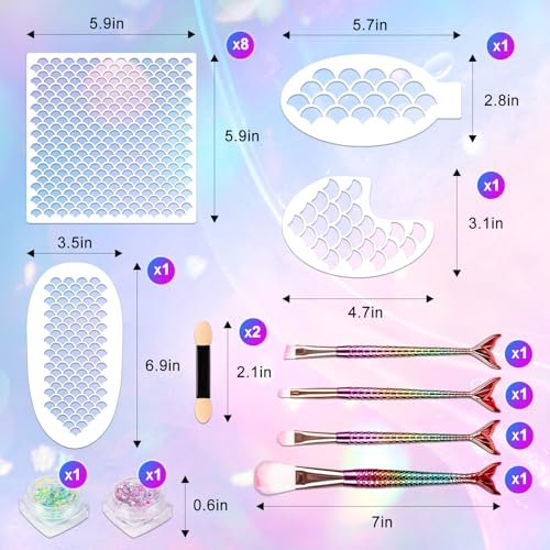 Mermaid Scale Stencil Kit,11Pcs Reusable Mermaid Face Makeup Templates and 4 Pcs Makeup Brushes 2 Bottles Glitter, Women Girls Body Art Face Painting Wall Accessories