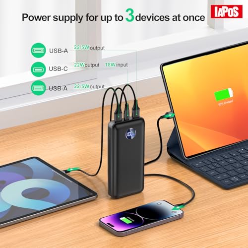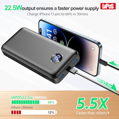 [22.5W Fast Charging Power Bank, 5.5 Times Faster]: IAPOS portable charger offers an astounding 22.5W fast charging speed and 18W fast recharging speed, making it 5.5 times faster than conventional portable phone chargers, maximizing efficiency and productivity. [Triple-Port & Omnipotent Compatibility]: IAPOS battery pack portable charger comes with 2 USB-A (22.5W output) ports and 1 USB-C (18W input/22W output) port, allowing for simultaneous charging of up to three devices. IAPOS portable power bank widely compatible with iPhone 16/16 Plus/16 Pro/16 Pro Max/iPhone15/14/13/12/11, for Samsung Galaxy/Google Pixel and more Android phones/tablet and other electronic devices. [Large Power Bank Capacity with Compact Design]: 40,000mAh battery bank capacity compressed into a compact body and weighing only 15.3oz. (Equivalent weight of two phones). Whether you're camping traveling or even in the event of a power outage at home, the IAPOS 40,000mAh portable charger power bank ensures you always have reliable power! (IMPORTANT: 40000MAH PORTABLE CHARGER ARE NOT ALLOWED ON AIRPLANE) [Real-Time Power Monitoring]: IAPOS powerbank is equipped with a high-precision intelligent LED digital display that accurately reflects the remaining battery percentage, ensuring you are always in control. *(Note: The buttons of powerbank are for monitoring the remaining power in standby mode only) [Fortress-Like Security]: IAPOS external battery power bank has implemented state-of-the-art security protocols, including overcharge, overcurrent, and short-circuit protection. Your device is cocooned in safety while you indulge in effortless charging luxury.