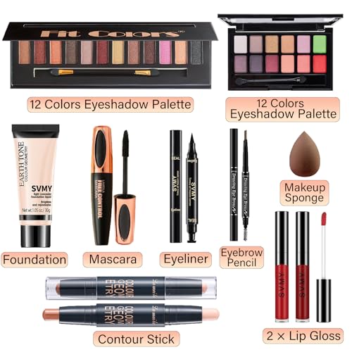 ??Face Makeup Set??This full face makeup set includes 12 shimmer colors eyeshadow palette, 12 mixed colors eyeshadow palette, nude liquid foundation, Contour Stick, 2 pcs lip gloss, eyebrow pencil, eyeliner stamp, mascara, canvas cosmetic bag, makeup sponge. One set can solve all your facial makeup.