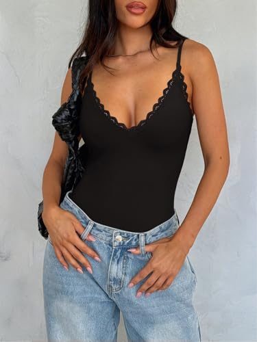 REORIA Women's Sexy V Neck Lace Backless Bodysuits Trendy Sleeveless Double Lined Thong Going Out Y2K Spaghetti Strap Tops